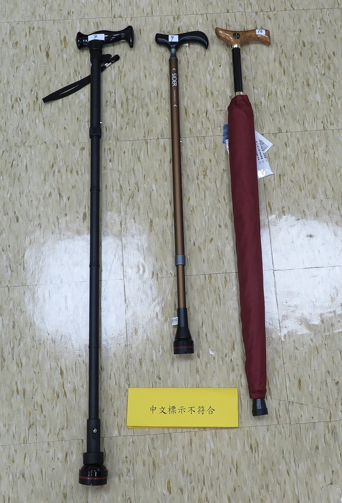 目前我國已正式進入高齡社會,因此高齡人口所需輔具產品品質與安全性愈形重要。經濟部標準檢驗局為維護消費者的安全及消費權益,於108年間於臺北市各輔具量販店及網路通路等販售通路,隨機購買10件非木質手杖(包括宣稱有手杖功能的雨傘手杖)執行檢驗。檢測結果「品質項目」全數符合,「商品檢驗標識」全數符合,「中文標示」計3件不符合規定。