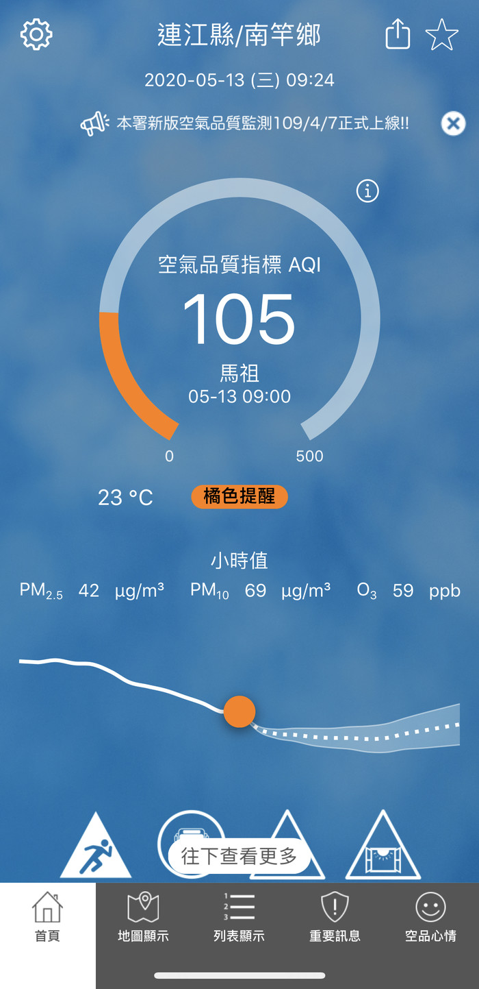 05/13品質指標AQI 105 --閱讀人次 : 513 依據環保署今日(05月13日)上午09時空氣品質監測結果,馬祖地區受境外污染物影響,空氣品質指標AQI為105,對敏感族群不健康,環境資源局提醒您