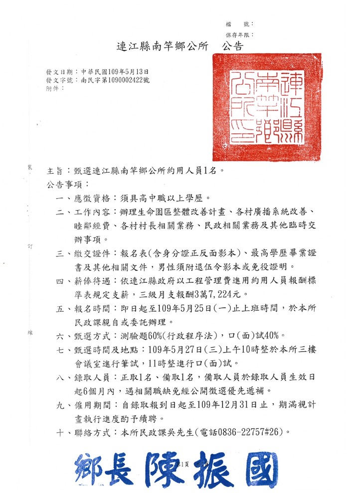 南竿鄉公所徵選約用人員1名