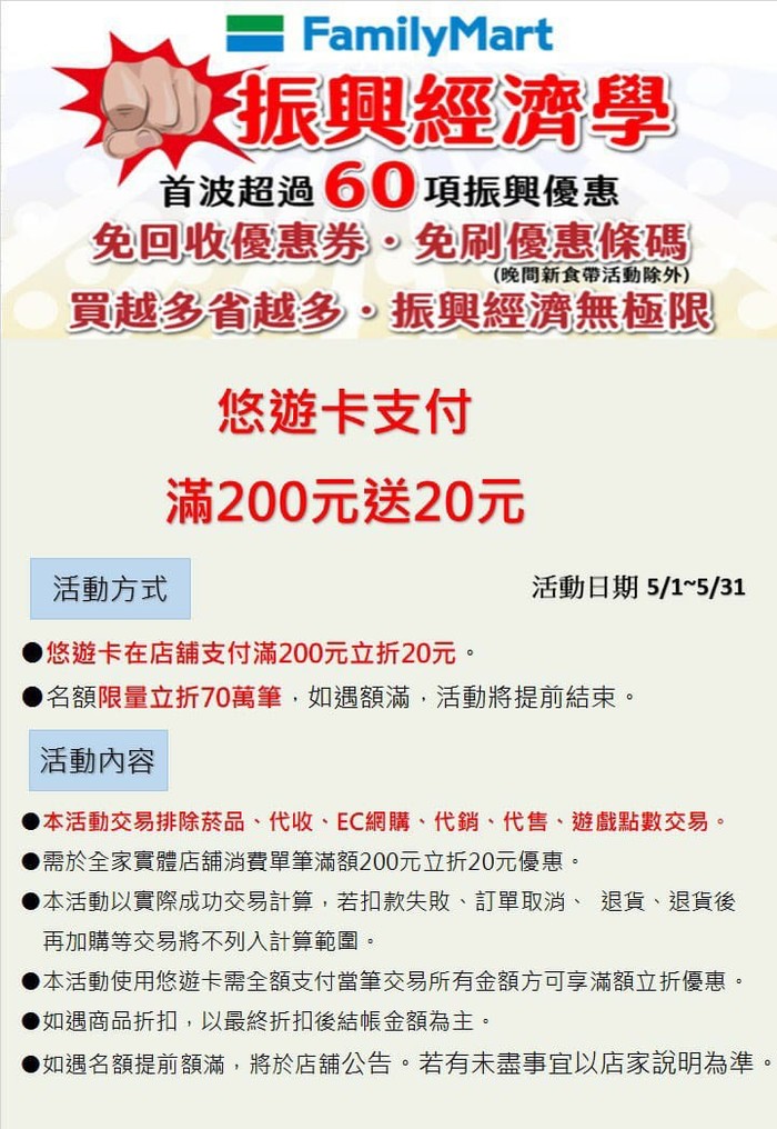 在5月份期間,單筆消費滿200元以上(不累加),使用"悠遊卡"支付 即享有折扣20元的優惠~