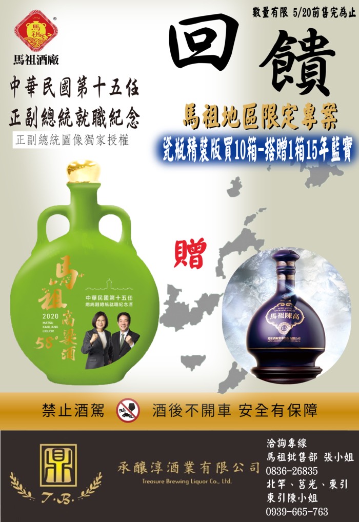 中華民國第15任正副總統就職紀念酒配售馬祖店家專案,買10箱瓷瓶裝就職紀念酒送1箱15年大藍寶陳年高粱酒,5月20日前售完為止。