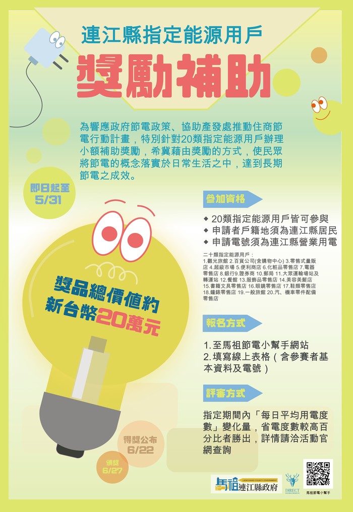 指定能源用戶獎勵補助總價值約二十萬元 --閱讀人次 : 1470 連江縣指定能源用戶獎勵補助活動來瞜!