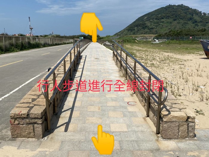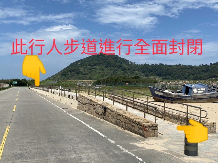 本公司承攬連江縣北竿鄉馬鼻灣海岸環境暨道路改善工程,塘岐馬鼻灣旁行人步道於六月五日起,因材料進場將進行行人步道封閉,請來往行人注意安全,造成不便之處,敬請見諒。