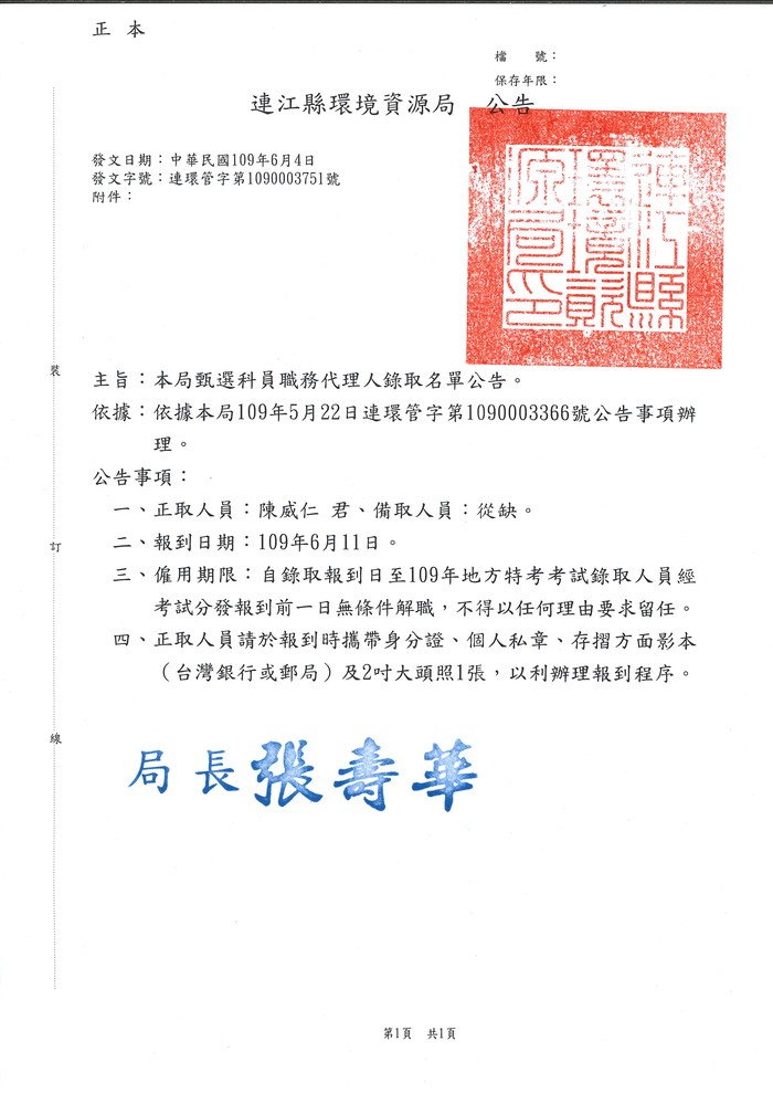 環資局甄選科員職務代理人錄取名單公告 --閱讀人次 : 1315 主旨:本局甄選科員職務代理人錄取名單公告。