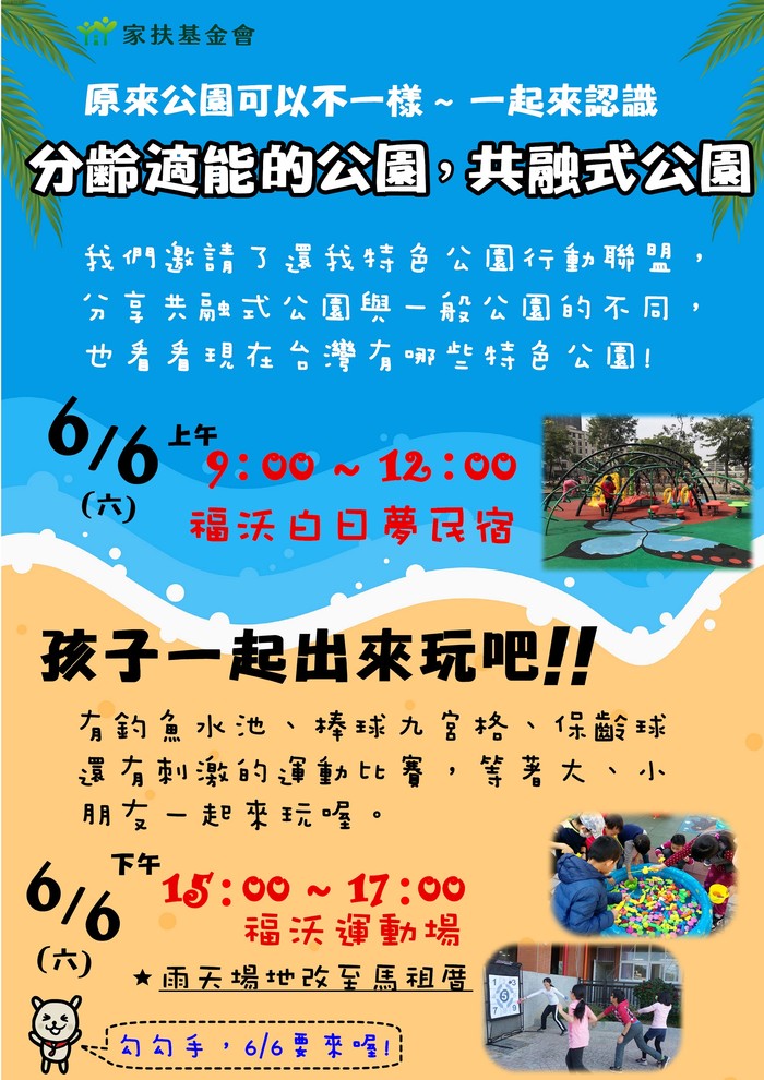 家扶邀請您,6/6上午0900-1200在福澳白日夢民宿一樓,當天由還我特色公園行動聯盟來和大家分享分齡適能和共融式公園,邀請大朋友小朋友一同來參加。