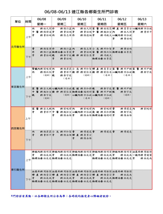06/08-06/13衛生所門診表