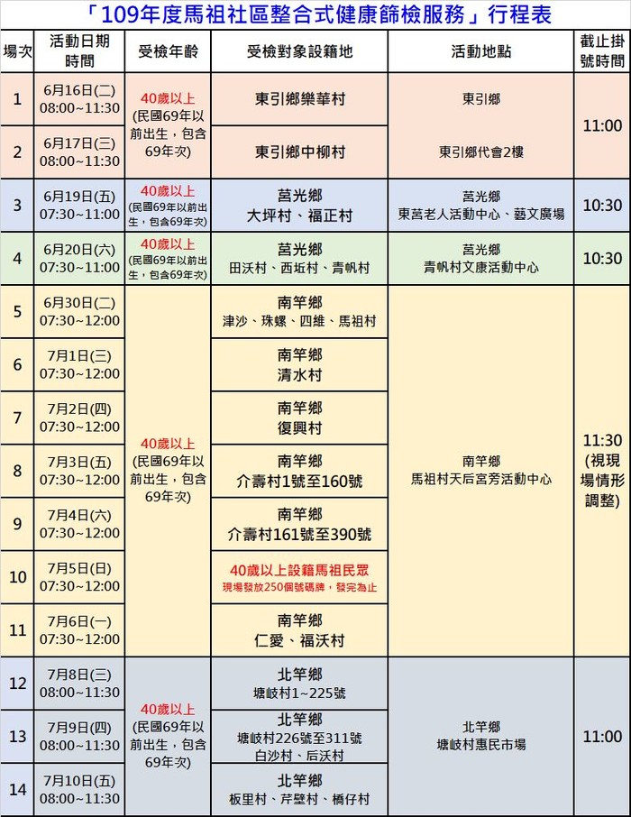 2.7/5(日)南竿場開放所有40歲以上設籍馬祖民眾健檢,早上7:30分發放250個號碼牌,發完為止。