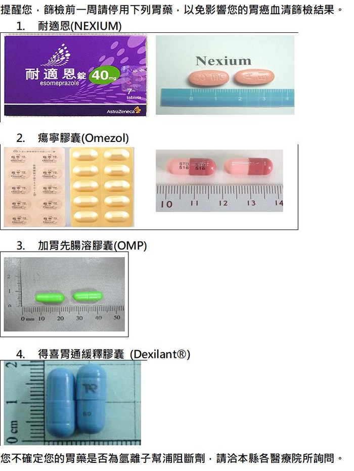4.今年有做胃癌風險血清檢測,請於篩檢前一週停用含氫離子幫浦阻斷劑的胃藥(請參考照片)。