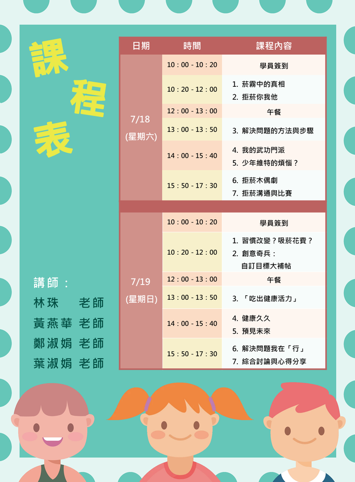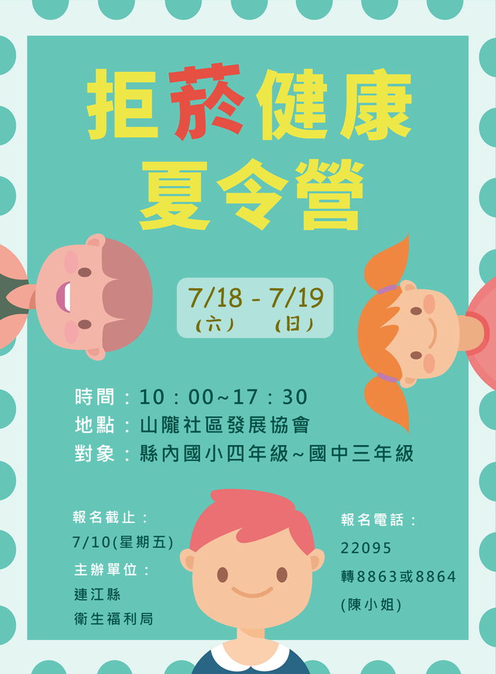 為推廣無菸家庭及健康生活,特別針對學童舉辦109年「拒菸健康」夏令營,課程內容由菸害防制知識、健康飲食與情緒管理三方角度課程切入,期許學童能從小培養健康觀念,認識吸菸以及二手菸與三手菸對健康的嚴重危害,歡迎大家踴躍來參與~一起成為家中的戒菸小幫手!