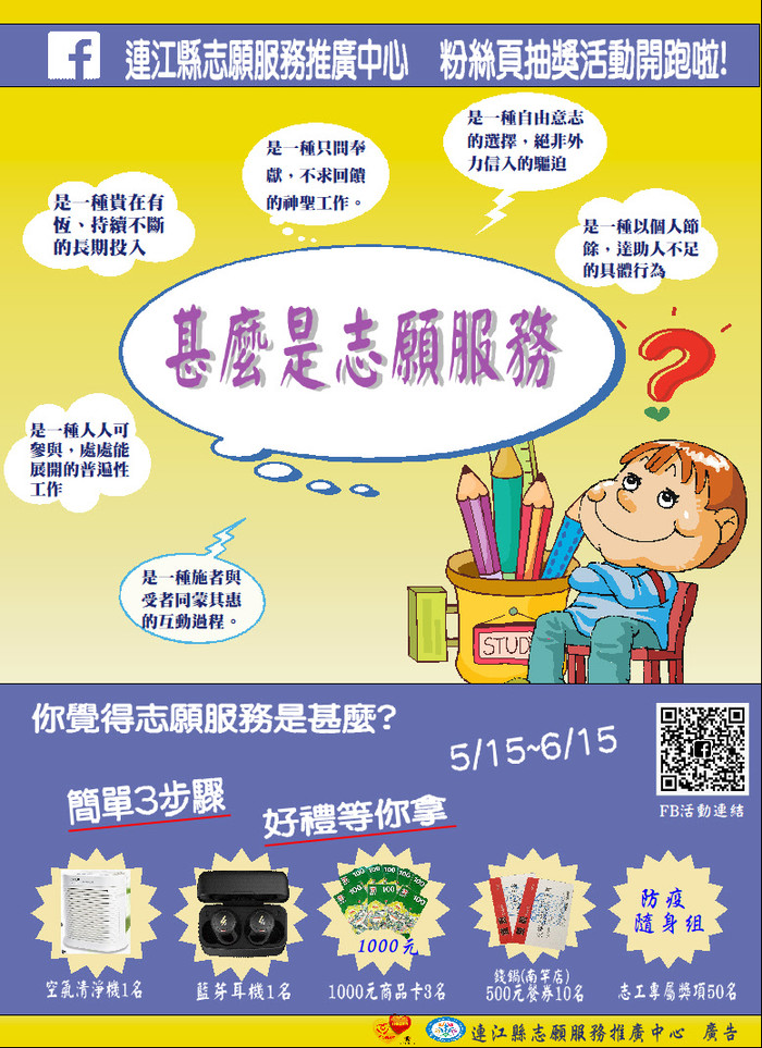 趕快拿起你的筆寫下:(你對志願服務的認知),前往中心FB粉絲頁,完成以下步驟即可參加抽獎
