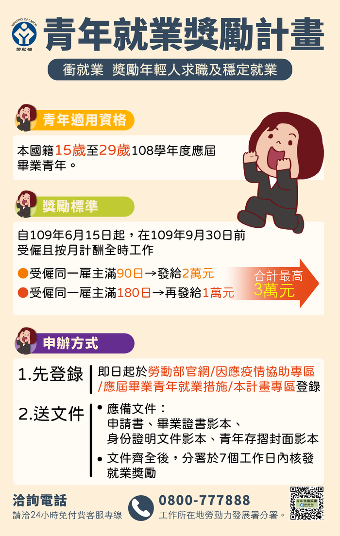 適逢畢業季節來臨及國內嚴重特殊傳染性肺炎(COVID-19)疫情已漸趨和緩,就業市場逐步復甦之際,勞動部即日起開辦「青年就業獎勵計畫」,針對108學年度應屆畢業的15-29歲青年提供最高3萬元就業獎勵,鼓勵社會新鮮人積極尋職並穩定就業。歡迎應屆畢業青年自109年6月15日起,儘速到「台灣就業通網站」的計畫專區,查詢相關資訊及線上登錄參加。