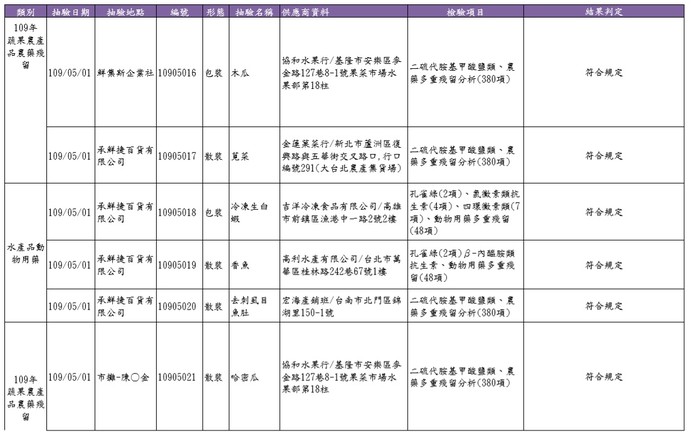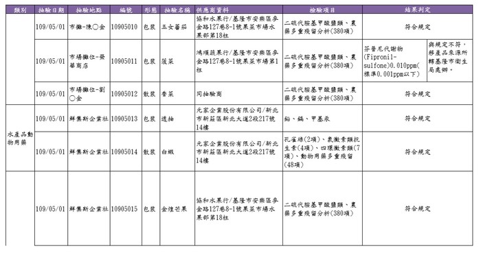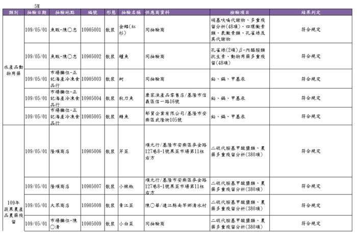 5月份蔬果、水產品及端午節抽驗結果 --閱讀人次 : 699 為維護民眾食用各類食物之安全,本局5月份至傳統市場、超市、餐飲業等抽驗生鮮蔬果檢驗殘留農藥,水產品類檢驗動物用藥、氯黴素類抗生素、四環黴素類、硝基呋喃代謝物、孔雀綠及其代謝物,並針對端午節應景食品粽子及其餡料(蝦仁、香菇、糯米)等抽樣檢驗衛生指標菌及食品添加物及黃麴毒素。5月份共抽驗12件生鮮蔬果、10件水產品、1件粽子及4件餡料、1件麵包,共計28件,其中1件蔬菜(菠菜)檢驗出殘留農藥超出法規限量標準,故判定不符法規規範(詳如抽驗清冊) ,本局已令攤商將違規產品下架不得販售,另訪談該販售業者後案移源頭基隆市衛生局進行後續處辦。