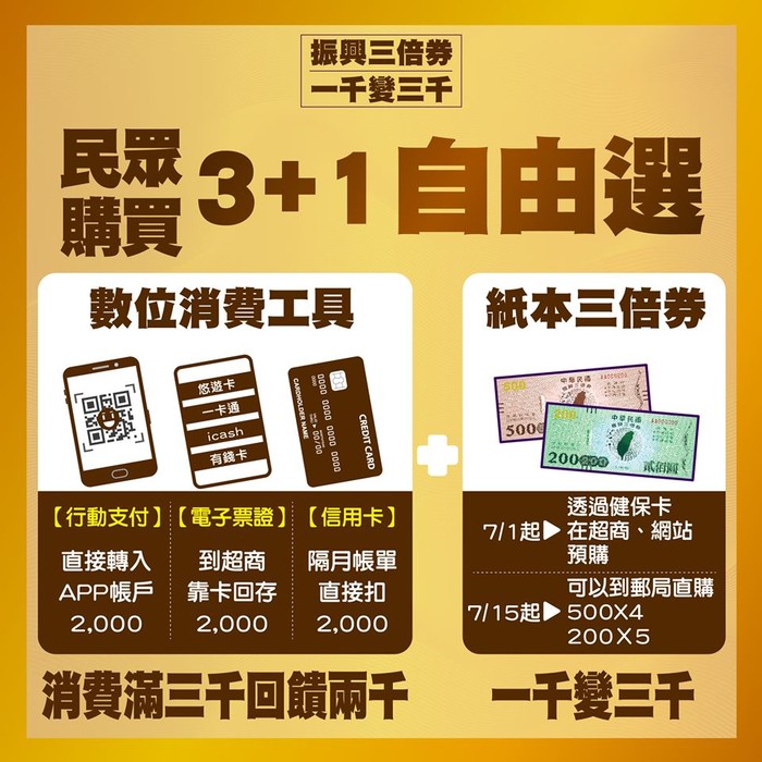 只要是中華民國人民及有居留權的配偶,都可以來領三倍券。我們提供3+1種方案,讓大家自由選擇!