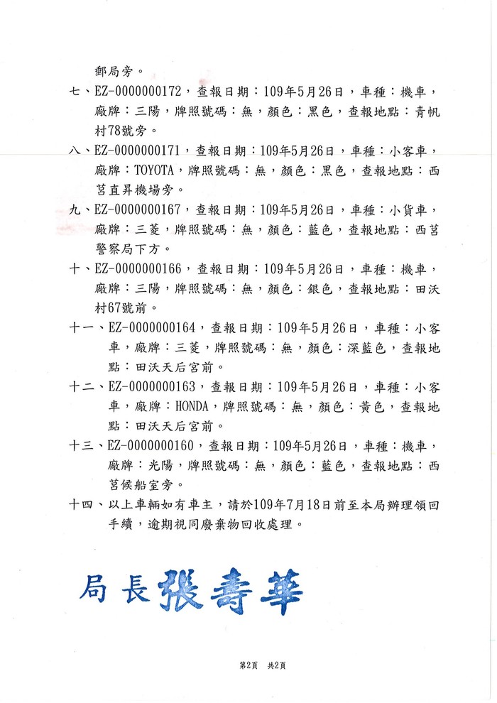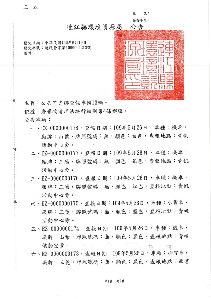 查報莒光鄉棄置廢棄車輛一批