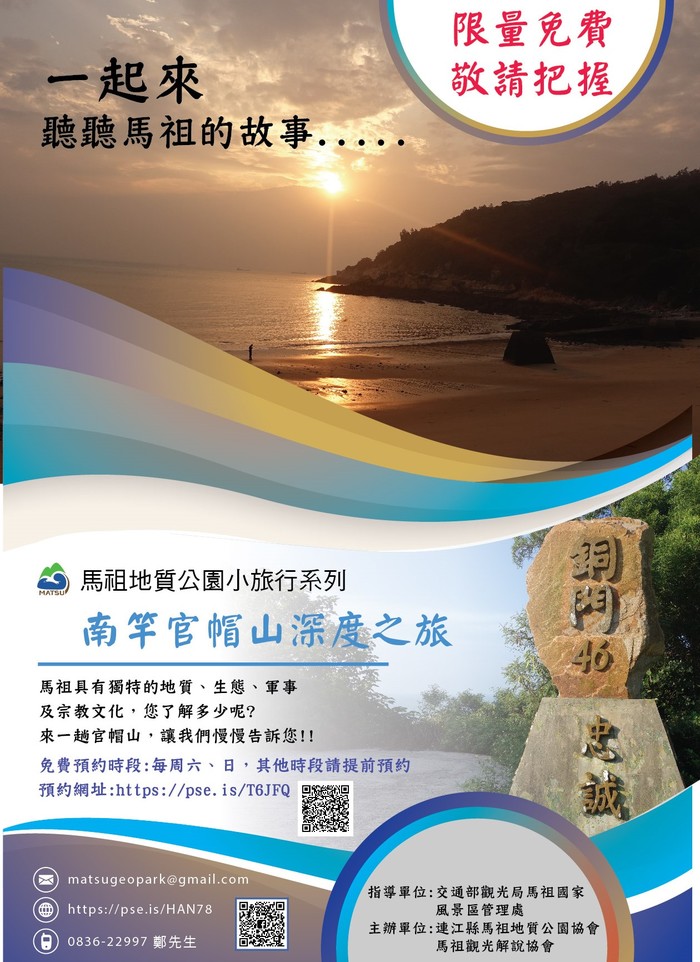 南竿官帽山深度之旅 --閱讀人次 : 1441 由馬祖地質公園協會協辦,馬祖觀光解說協會主辦,並由馬管處輔導的官帽山解說活動,將在暑假熱鬧登場囉!