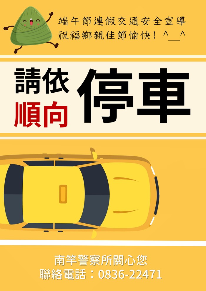 南竿警察所提醒您,出門遊玩時,車輛請依順向停放,才不會危害用路人的安全唷!