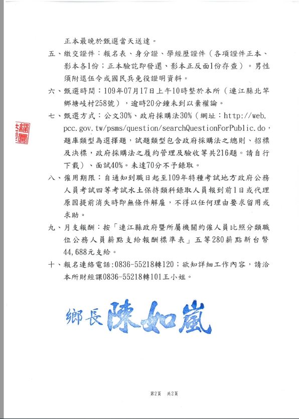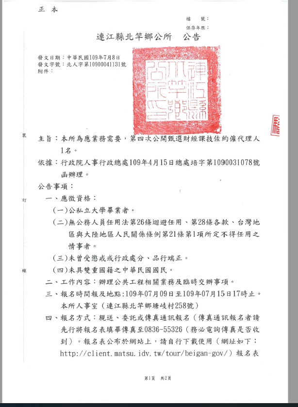 北竿鄉公所第四次甄選技佐約僱代理1名