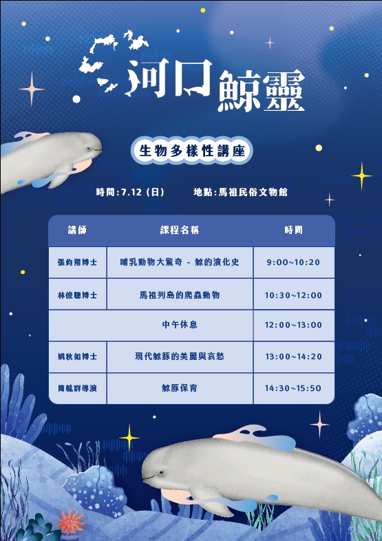 第四個限定:為了讓大家更加了解馬祖生態環境,於7月12日(日)特別舉辦「河口鯨靈-馬祖生物多樣性講座」,透過研究博士生動活潑的講座,讓大家更加了解馬祖的生態獨特性,參加講座著可獲得「馬祖島嶼博物館」束口袋一份,如需導覽時數認證者亦可登錄時數,歡迎大家進入下列網址報名參加。