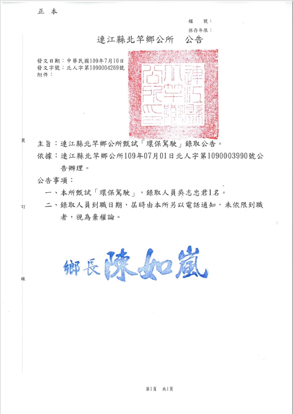 北竿鄉公所環保駕駛錄取公告