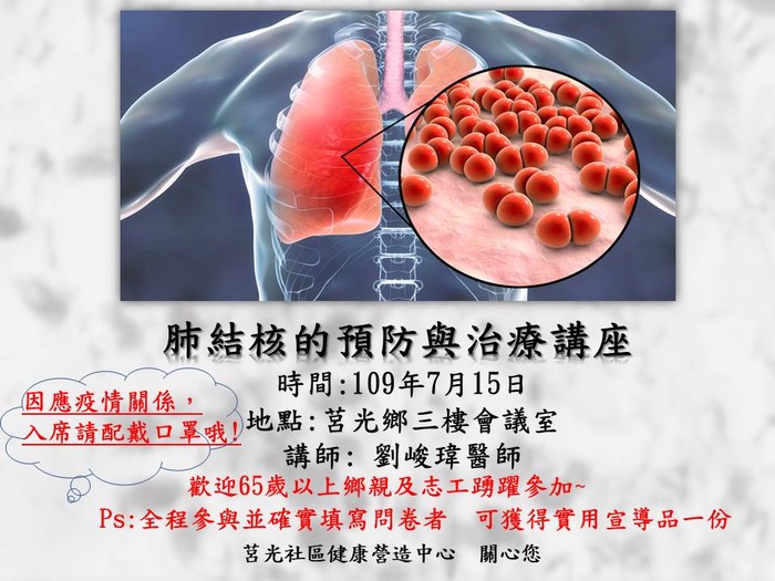 莒光社區健康營造中心7月15日晚上7點在莒光鄉公所三樓會議室辦理「肺結核的預防與治療講座」活動,歡迎65歲以上鄉親及志工踴躍參加。