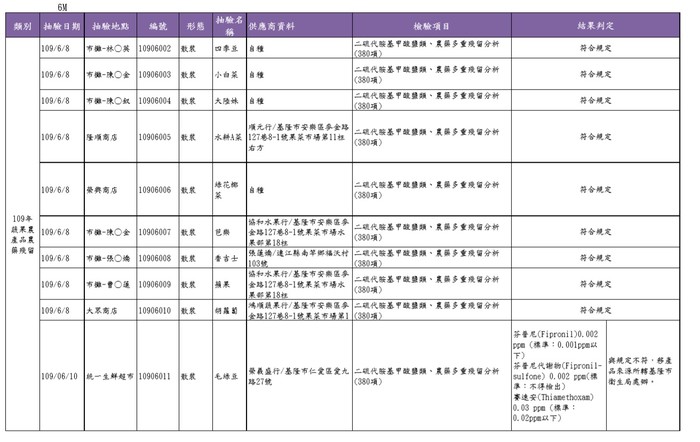 6月份市售蔬果抽驗結果 --閱讀人次 : 669 為維護民眾食用生鮮蔬果之安全,本局至傳統市場、超市等抽驗生鮮蔬果檢驗殘留農藥,6月份抽驗10件生鮮蔬果,其中1件綠豆檢驗出殘留農藥超出法規限量標準,故判定不符法規規範(詳細抽驗清冊參閱附件),本局已即令攤商將違規產品下架不得販售,並退回剩餘產品予供應商,另訪談該販售業者後案移源頭基隆市衛生局進行後續處辦。