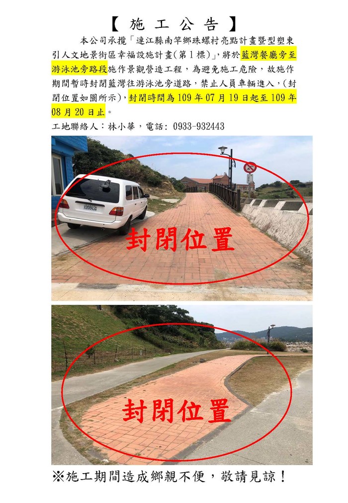 藍灣餐廳旁至游泳池旁施工啟事
