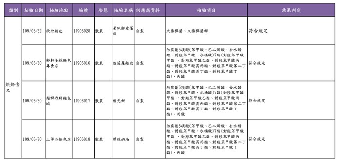 本次專案針對本縣烘焙業者總計查核4家(欣欣麵包店、郁軒蛋糕麵包專賣店、超群西點麵包城、口福西點麵包),GHP查件缺失為報廢品未分區放置、盛裝桶髒污、食材未離地放置等缺失,均命限期改正後複查合格。抽驗4件產品檢驗衛生指標菌及防腐劑,結果皆符合規定(詳如附件名冊)。