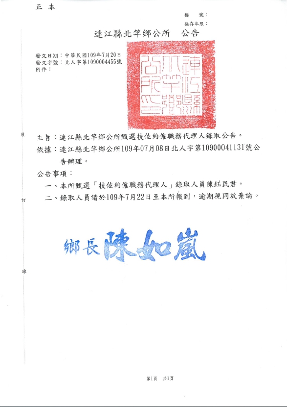 北竿鄉公所技佐約僱職務代理人錄取公告