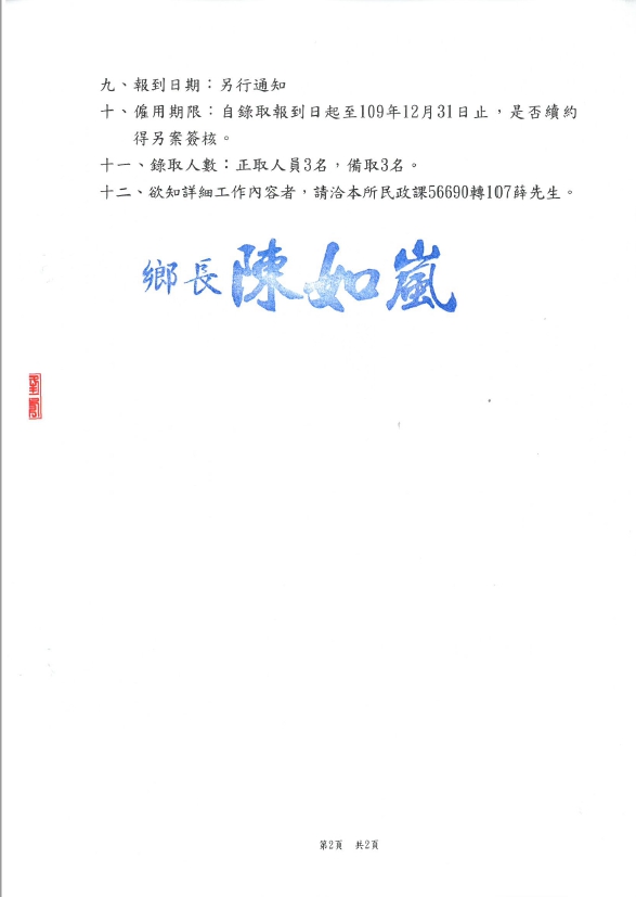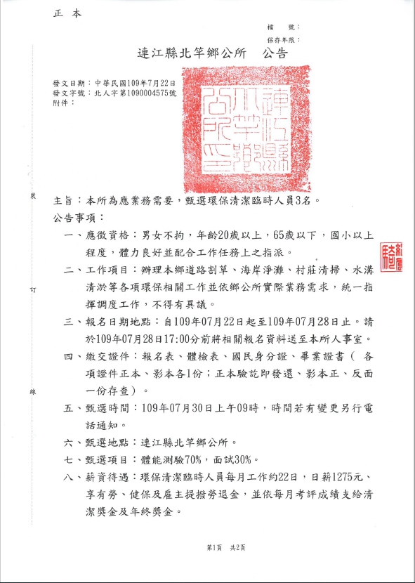 北竿鄉公所甄選環保清潔臨時人員3名