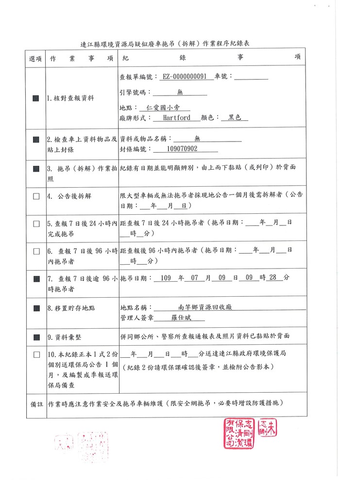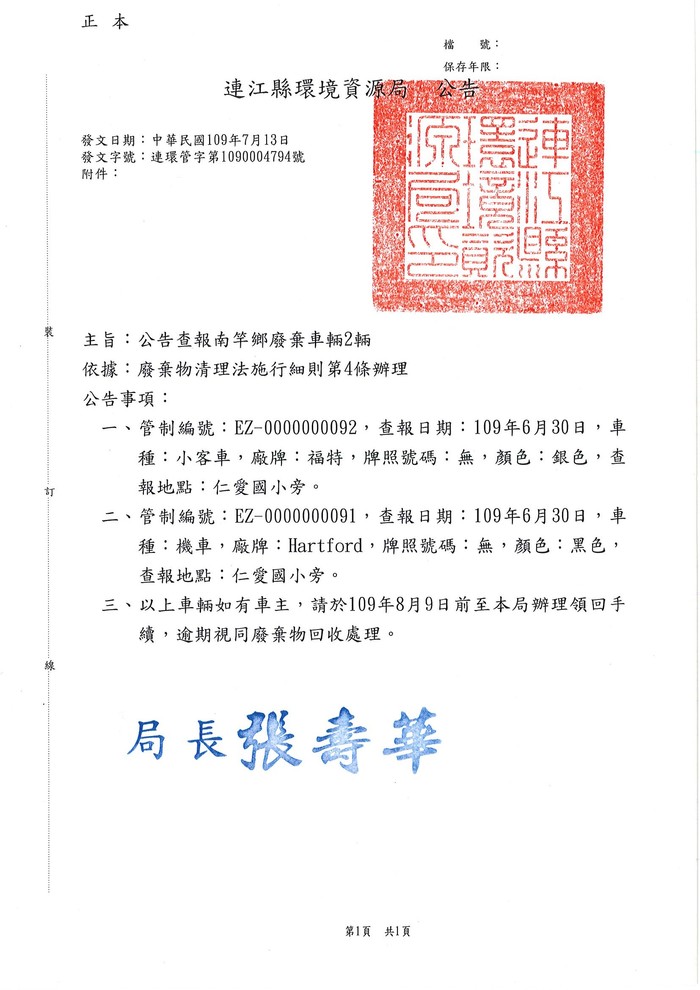 公告查報南竿鄉廢棄車輛2輛