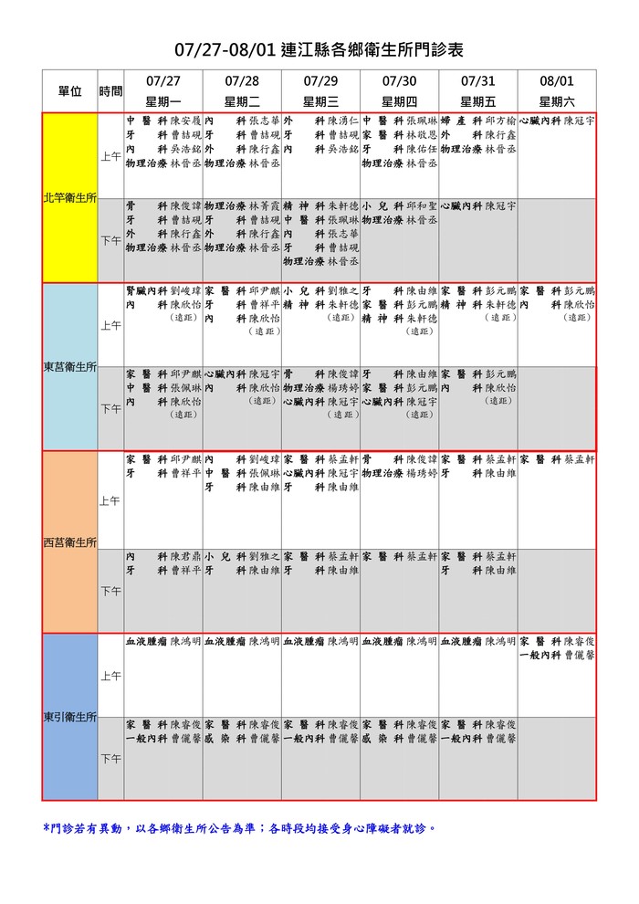 0727-0801連江縣各鄉衛生所門診表: