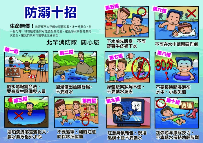 北竿分隊呼籲海灘戲水應注意自身安全 --閱讀人次 : 680 炎炎夏日,游泳是一項清涼消暑,又可以達到健身效果的活動,因此北竿消防分隊再次提醒鄉親選擇北竿芹壁沃口或塘后沙灘從事水上活動之前,一定要切實遵守下列各項規定並熟知「防溺十招」及「救溺五步」,才能夠避免意外發生,快快樂樂戲水,平平安安回家。