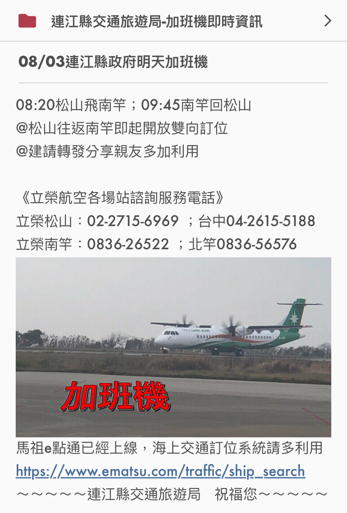 縣府3日上午南竿加班機 即起開放訂位