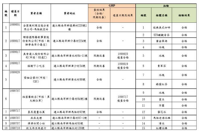 本次專案共計查核7家飲冰品業者(全家便利商店馬祖航空站、歇腳亭南竿介壽店、榕樹下小吃店、85度C、C&Y、黑丸嫩仙草、星辰漫畫冰菓)作業環境衛生,初查結果3家食品衛生缺失,缺失項目為製茶機有汙漬、食品從業人員未依規定體檢、食材及器具置於地面,均命限期改正後複查合格。另抽驗10家業者共15件產品,進行衛生指標菌、防腐劑、農藥殘留等項目檢驗,檢驗結果均與規定相符(詳如附件名冊)。