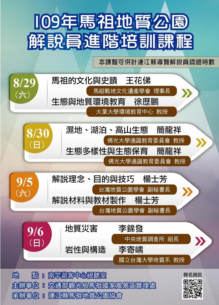 馬祖地質公園解說員進階培訓課程 --閱讀人次 : 1650 馬祖地質公園是全台灣第一個依法公告的地方級地質公園,為提升馬祖解說服務的品質,邀請專業的講師來馬祖,進行地質公園解說員進階課程的培訓,內容包括歷史文化、環境教育、生態保育、地質岩性及地形等共14堂28小時的課程。課程內容深入淺出,目前已規劃24小時課程,後續還有4小時地形相關課程。本課程除了提供本協會地質公園解說員進階課程參加時數證明外,也併計連江縣導覽解說員認證時數,歡迎大家對解說有興趣或是想學習新知識的,踴躍報名參加,名額有限,請提早報名。