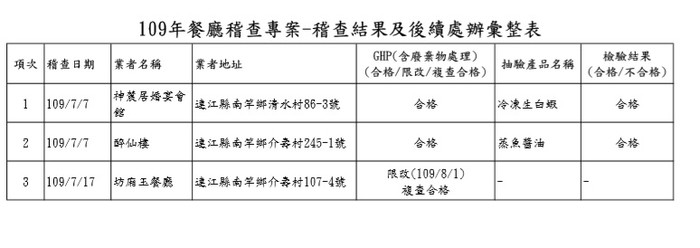 本次查核3家桌數10桌以上之餐廳環境衛生,1家初查有冰箱食材未覆蓋、擺放廢棄櫃子具病媒等衛生缺失,命限期改正後複查合格。另抽驗2件食材檢驗食品添加物,結果均與規定相符(詳如附件名冊)。