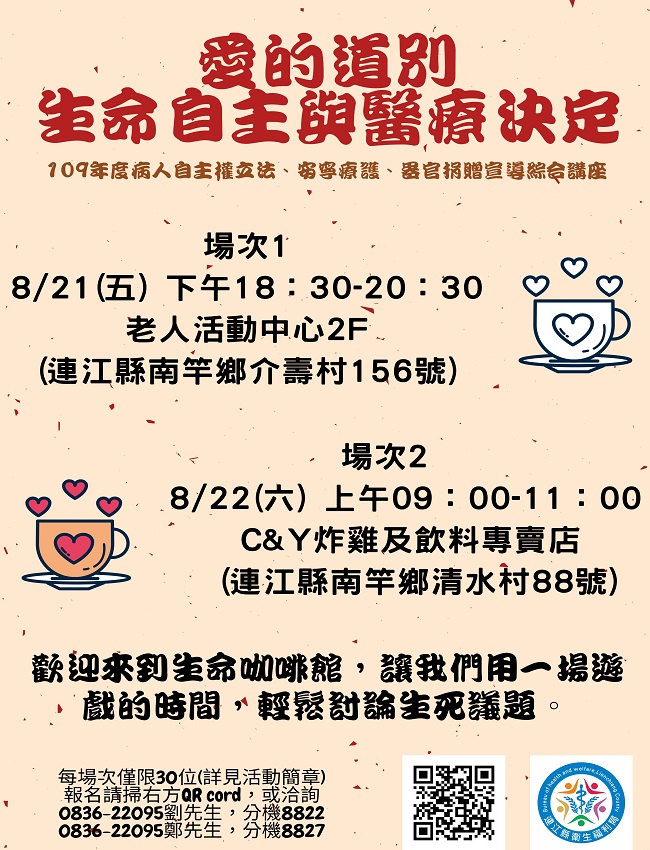 聯絡方式:連江縣衛生福利局醫政科0836-22095,劉先生,分機8822;鄭先生,分機8827。