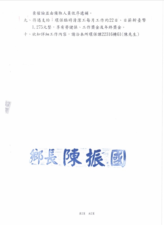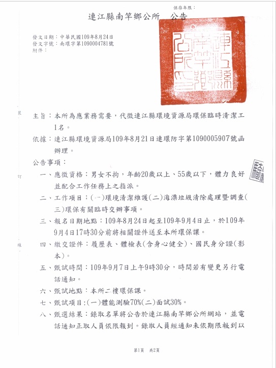 南竿鄉公所代徵連江縣環境資源局環保臨時清潔工1名,詳如公告,有意願應徵者,請附履歷表、體檢表、國民身分證(影本)。