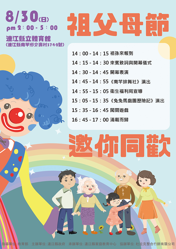 依公依嬤齊同樂,連江縣家庭教育中心30日下午2時於南竿體育館辦理109年度祖父母節慶祝活動,節目精彩有趣,除了舞台上戲劇的演出,傳達祖輩世代情感,開場前還安排氣球表演、可愛人偶與民眾互動。此外,現場另有宣導攤及祖孫闖關遊戲,邀請祖孫們一起快樂參與,將對彼此的關懷和感恩表達出來。全程參與者,將獲得精美宣導品乙份,數量有限,送完為止。