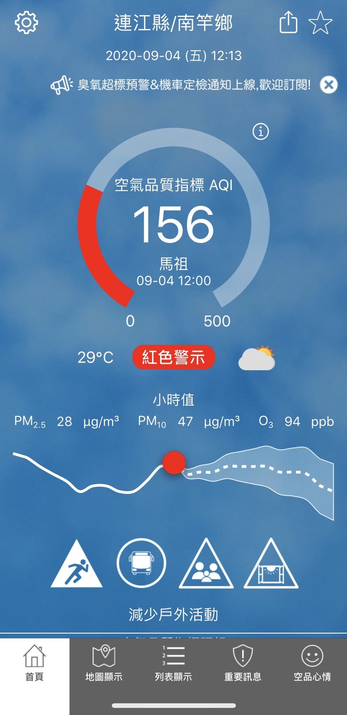 09/04空氣品質指標AQI 156 --閱讀人次 : 570 依據環保署今日(09月04日)下午12時空氣品質監測結果,馬祖地區受境外污染物影響,空氣品質指標AQI為156,對所有族群不健康,環境資源局提醒您