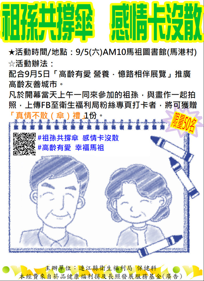 凡於開幕當天上午一同來參加的祖孫,與畫作一起拍照,並上傳FB至衛生福利局粉絲專頁打卡者,將獲贈「真情不散(傘)禮」1份。限量50份。
