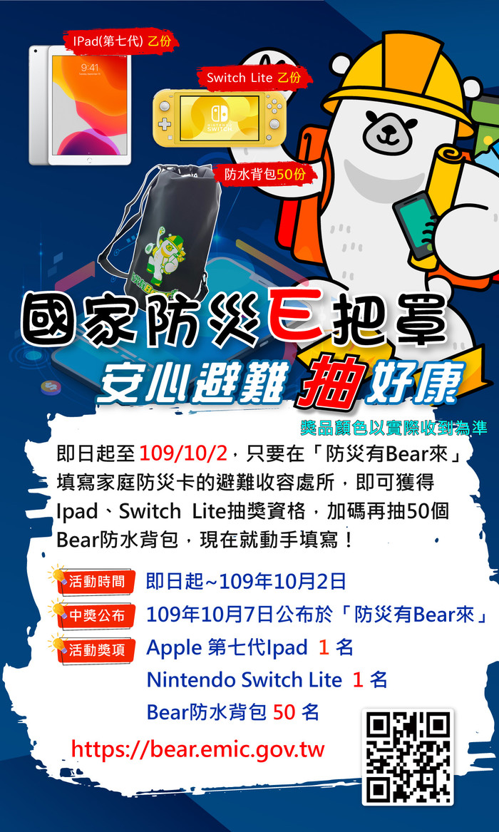 109年9月20日起至109年10月2日止,只要在【防災有Bear來】的家庭防災卡中設定好避難收容處所,就有機會抽中Apple Ipad及Nintendo Switch Lite及Bear防水背包,準備防災還能抽獎,這麼好康的活動,還不馬上參加?