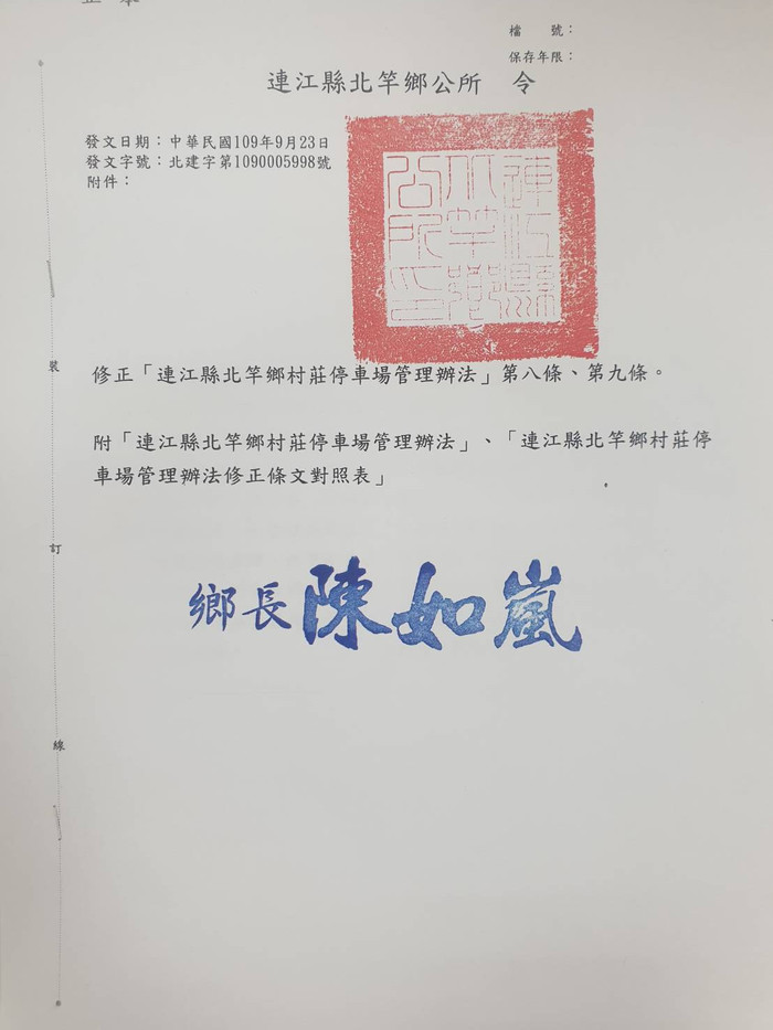 連江縣北竿鄉村莊停車場管理辦法 修正