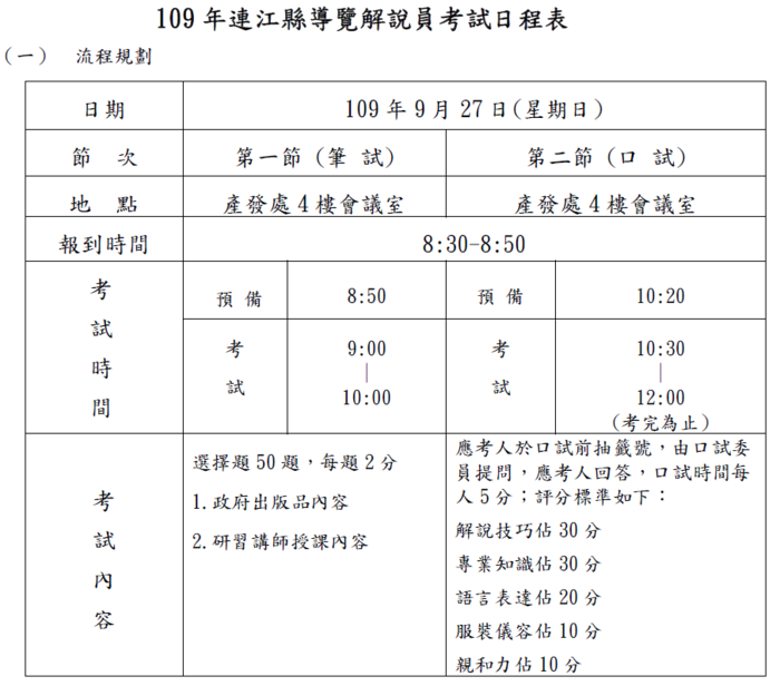 109年連江縣導覽解說員考試 --閱讀人次 : 1302 一、考試日期:民國109年9月27日(星期日)。