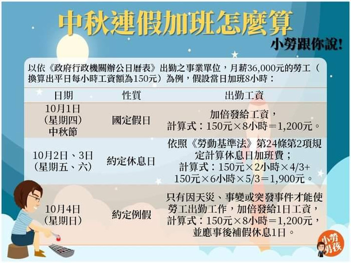 中秋連假勞工出勤權益知多少?! --閱讀人次 : 927 1.109年10月1日(四)中秋節,為勞基法所規定之國定假日,勞工應放假1日,勞工中秋節出勤,應依勞基法規定加倍發給工資(領當月薪資額36,000元外,加發國定假日加班費1,200元)或擇日補休1日。
