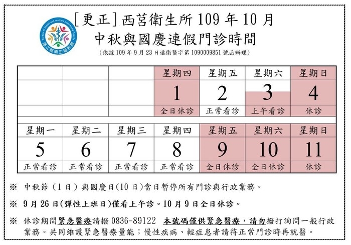 西莒衛生所原定10/9(五)正常開診,奉本縣衛生福利局來函指示調整為「全日休診」;國慶連假期間10/9(五)-10/11(日)衛生所僅提供「緊急醫療」服務,欲申辦各項行政手續,或開立慢性處方藥品的民眾,請您提早辦理。