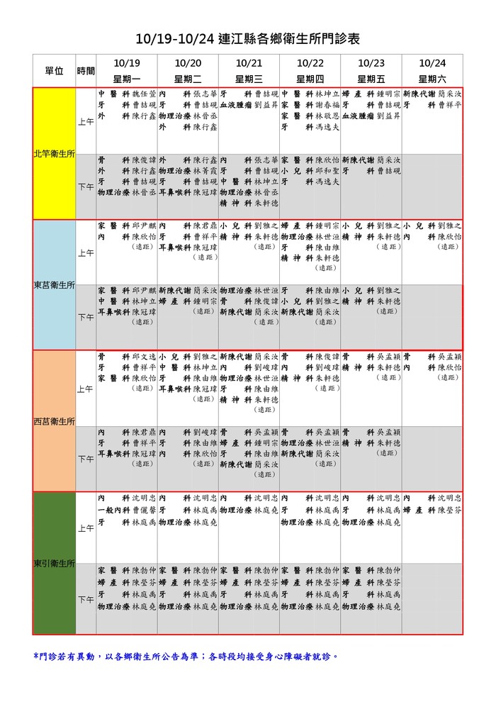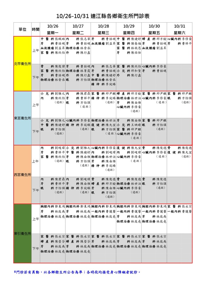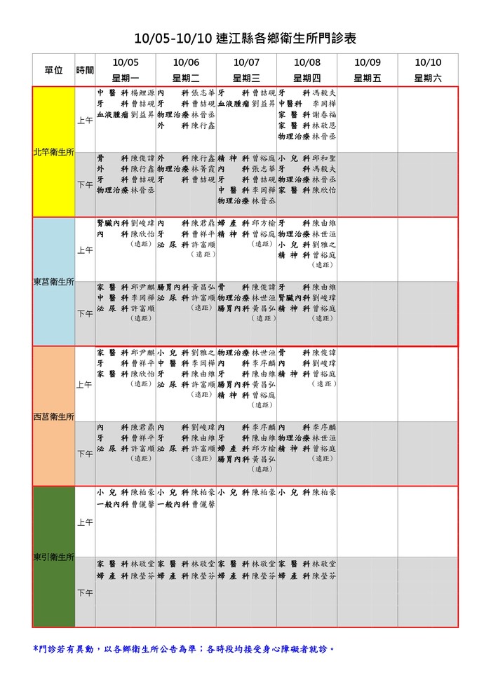 10/5-10/31各鄉衛生所門診表 --閱讀人次 : 1268