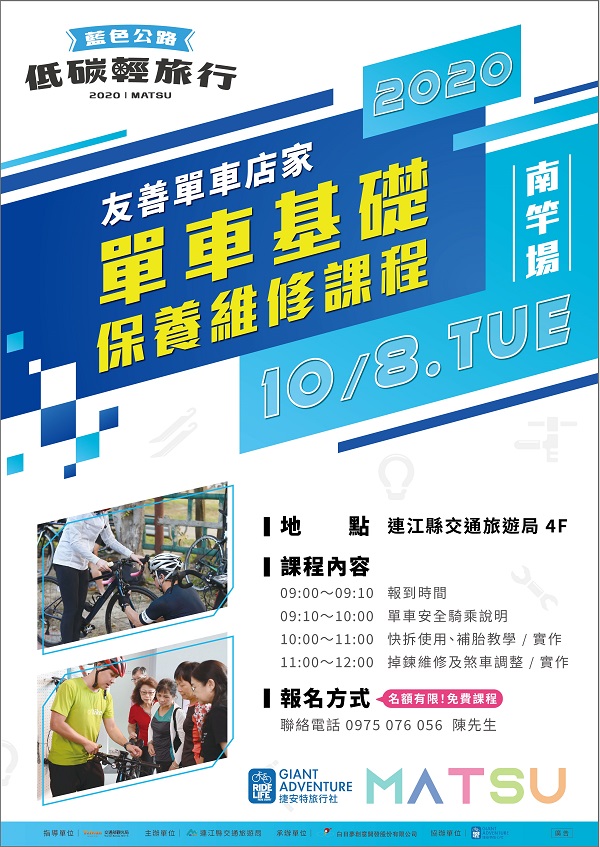友善單車免費課程-自行車基礎保養維修 --閱讀人次 : 853 迎接台灣「2021年自行車旅遊年」的觀光盛事,馬祖連江縣交通旅遊局超前部屬,於10月8日(四)辦理【免費】的自行車輔導課程,藉此有效提升民宿之服務內容的豐富度以及增加曝光度。
