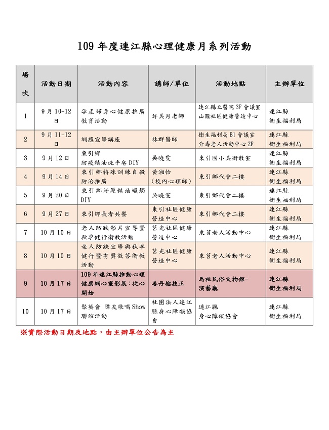 連江縣衛生福利局為強調心理健康的重要,將9-10月份擴大為心理健康月,辦理了許多活動,呼籲本縣民眾一起重視「心理健康」,希望藉此打造連江縣幸福島嶼之願景。