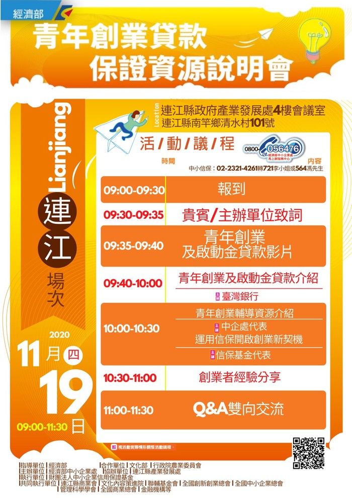 連江縣政府產業發展處協助安排信保基金於109年11月19日(四)辦理馬祖場次創業貸款資源說明會,若您有創業資金需求或曾遇申貸問題,歡迎報名參加! 說明會資訊詳如報名網頁